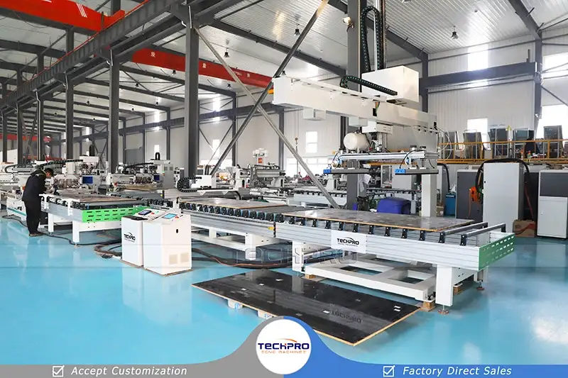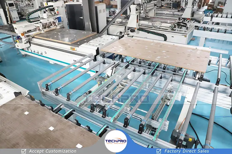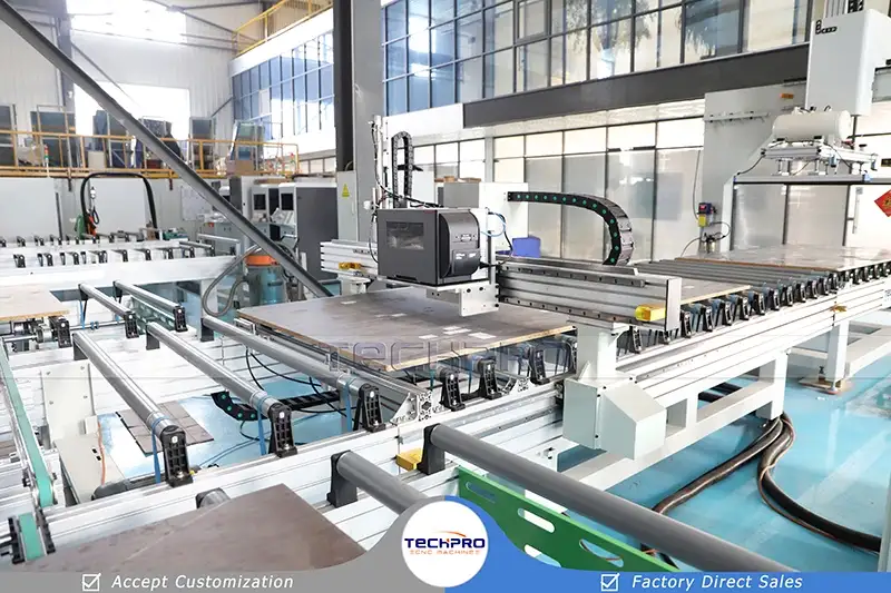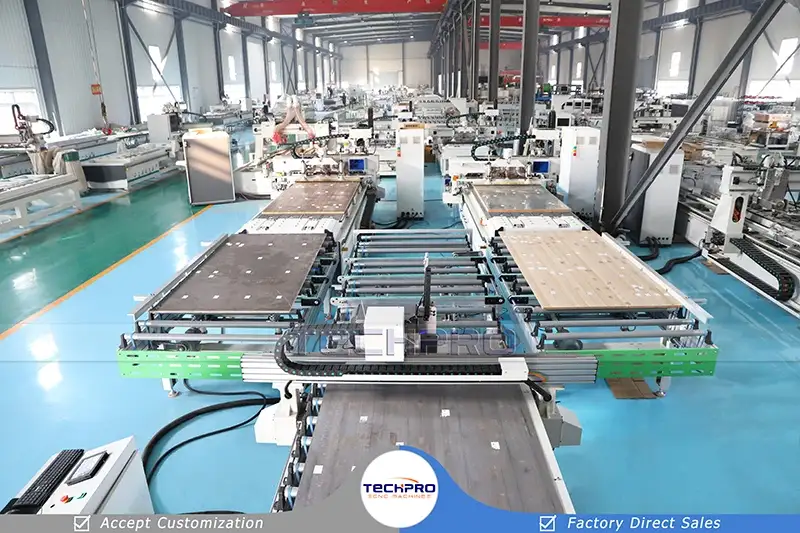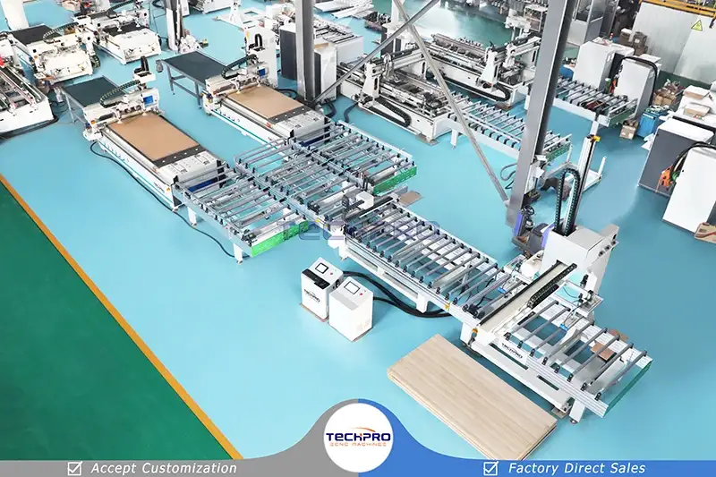 TechPro migliore linea di produzione di mobili con router CNC dotata di un set di macchina per etichettatura automatica, due set di router CNC per incassatura, un set di carico automatico a ponte e due set di tavoli di scarico. Permette a più macchine CNC per legno di lavorare insieme per migliorare l'efficienza del processo. Principalmente usato per lavorazione del legno, produzione di mobili, realizzazione di mobili e altri progetti e piani di lavorazione del legno.